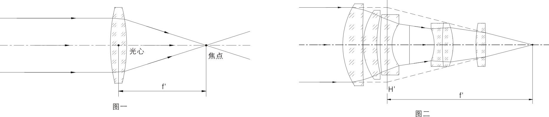 光の光軸を凸レンズに平行にして、すべての光が一点に集まり、その後、円錐状に広がるのが理想的なレンズで、このすべての光が集まることを「焦点」といいます。 単レンズの場合、図1のように光の中心から焦点位置までの距離を焦点距離とし、レンズ群で構成される複数のレンズの場合、図2のように画像の主平面から焦点位置までの距離を焦点距離とします。