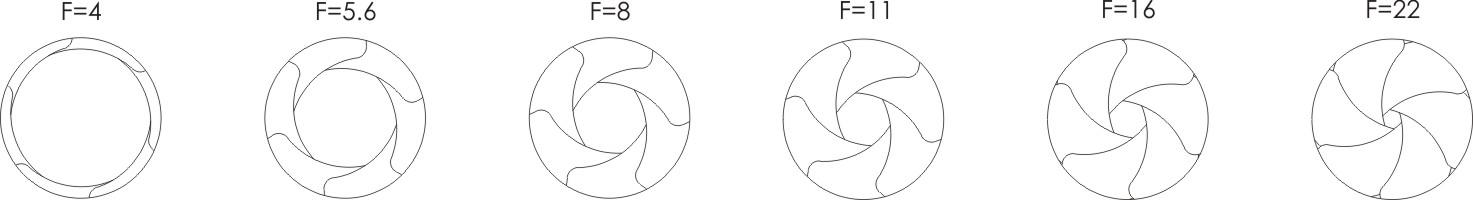 F/#の値が小さいほど、絞りを大きくすることができます。 一般的にF/#の値は√2倍刻みで増加していくので、一般的な絞りのカウントはF1.4、F2.0、F2.8、F4.0 ...... 同じ単位時間内に上段を通過する光の面積が下段の2倍になること、例えばF/8からF/5.6に絞りを調整した場合、通過する光の面積は2倍になる。