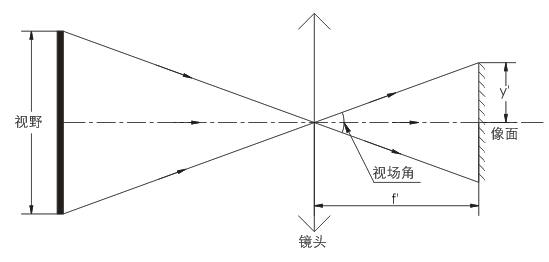 光学工学では、視野角とはレンズのイメージセンサーへの張り出し角度であり、すなわちy'をセンサーの半対角線長とすると、視野角2θ≒2*arctan(y'/f')となる。