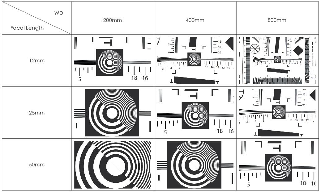 同じワーキングディスタンスでは、焦点距離が短いほど視野が広くなり、同じ焦点距離で一定の視野を持つ場合は、ワーキングディスタンスが遠いほど視野が広くなります。