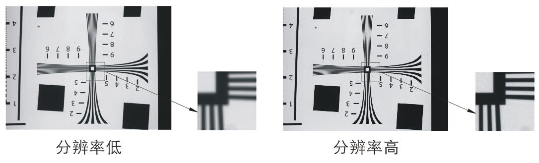 解像度とは、光学系で測定可能な被測定物上の識別可能な最小の特徴サイズのことです。 レンズで解像できる対象物の細かさが小さいほど、レンズの解像度は高くなります。 通常、画像面で解像できる1ミリあたりの白黒の縞のペアの数(lp/mm)で表されます。