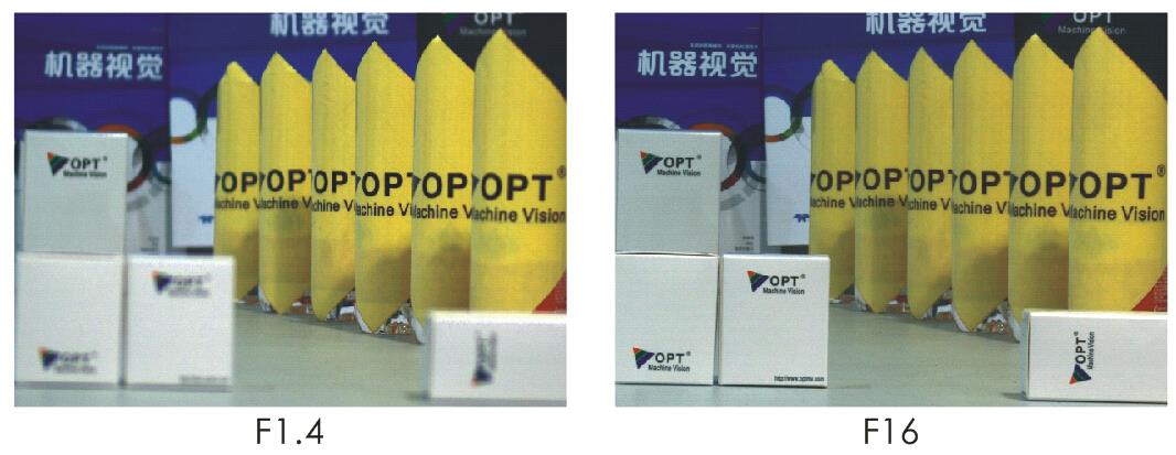 上の2枚の画像は、同じOPT-C3514-5Mレンズで同じワーキングディスタンスで撮影したものです。 左がF1.4、右がF16の絞りで、右の方が被写界深度が大きいことがわかります。 |