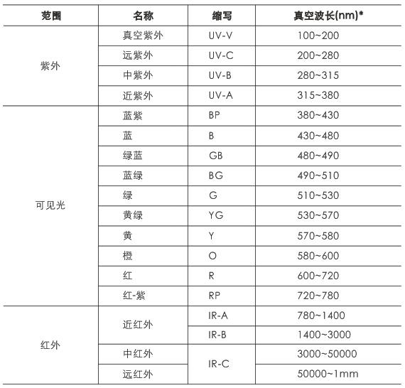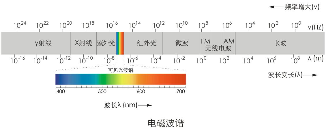 光は本質的には電磁波であり、電磁波の全スペクトルの中で、可視光はそのごく一部を占めている。380nm〜760nmの間の波長の部分は人間の目で知覚することができ、可視光と呼ばれ、異なるスペクトルは異なる色に対応している。 目に見えない光では、一般的に10nm~400nmの波長を紫外線、770nm~1mmの波長を赤外線と呼んでいます。 電磁波のスペクトルは図のようになっています。