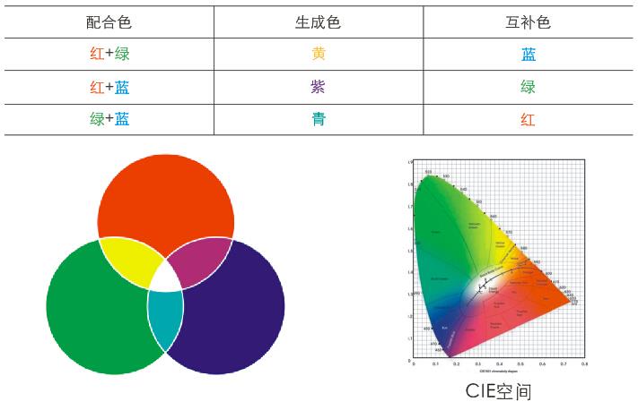 紫から青、シアン、緑、黄、オレンジ、赤へと続く色のグラデーションでは、赤、緑、青の3色のうち、どれか1色が他の2色と混ざり合うことはありません。 これらを一定の割合で混ぜると、白色光を含むあらゆる色になることから、3つのベースカラーと呼ばれています。 これをベースにして、色空間が作られます。よくRGB空間と呼ばれますが、色はその空間の一点に対応します。 この他にも、HSI、CIE、CMY、CMYK(印刷用)など、様々なカラースペースがあります。 2つの色に全く同じ基本色成分が含まれている場合、その2つの色は同じであると言い、2つの色の組み合わせが異なっていてもあまり変わらない場合、その2つの色は似ていると言い、2つの色に共通成分がない場合、その2つの色は対照的であると言い、2つの色が適切な割合で混合されて白色光を生成する場合、その2つの色は以下のように言います。 補完的な色。