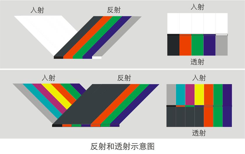 光が物体の表面に当たった場合、反射光の色は主に物体の表面の自然な色に対応し、光が透明な物体を通過した場合、透過光の色は主に透明体の色に対応する。 入射色が対象物自体の色と一致または近い場合、反射率や透過率は高くなり、逆に入射光が対象物の自然な色と対照的な色の場合、反射率や透過率は低くなります。