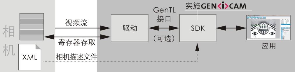 GenApi:(Generic Application Programming Interface)は、イメージャーのアプリケーション開発インターフェースを設定するためのものです。 このファイルには、(標準およびカスタム)カメラが持つすべての機能がリストアップされており、カメラレジスタへのマッピングが定義されています。 ファイル形式はXMLベースなので、読み取り可能です。 このファイルは通常、カメラのファームウェアに保存されており、カメラがシステムに初めて接続されたときに、ソフトウェア開発キットによって取得することができます。