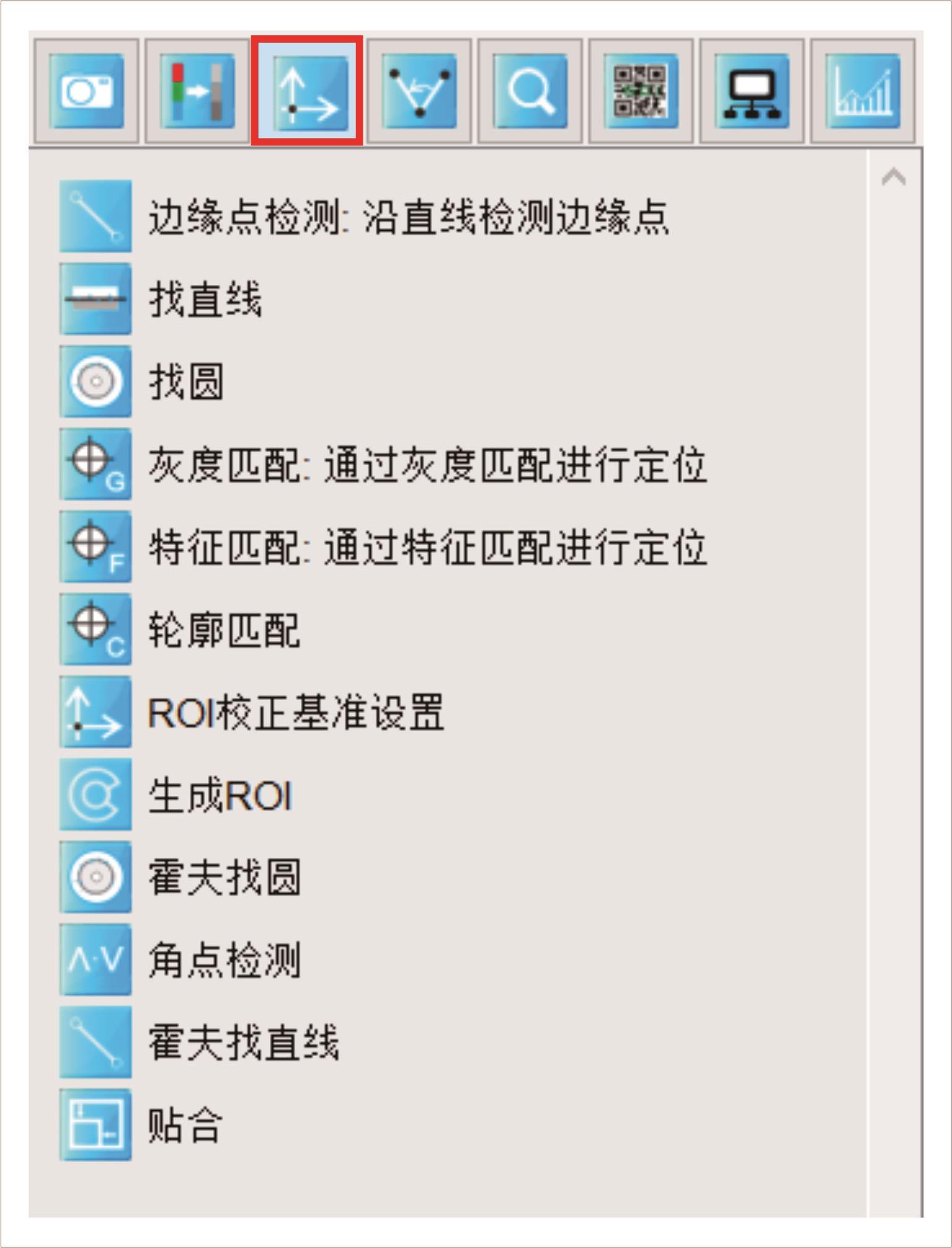 打开SciSmart智能视觉软件,在主界面右下方工具箱栏点击图像定位的图标。在图像定位功能列表中可以看到,除找点外,还有灰度匹配、特征匹配、轮廓匹配、ROI校正等功能,如图1所示。