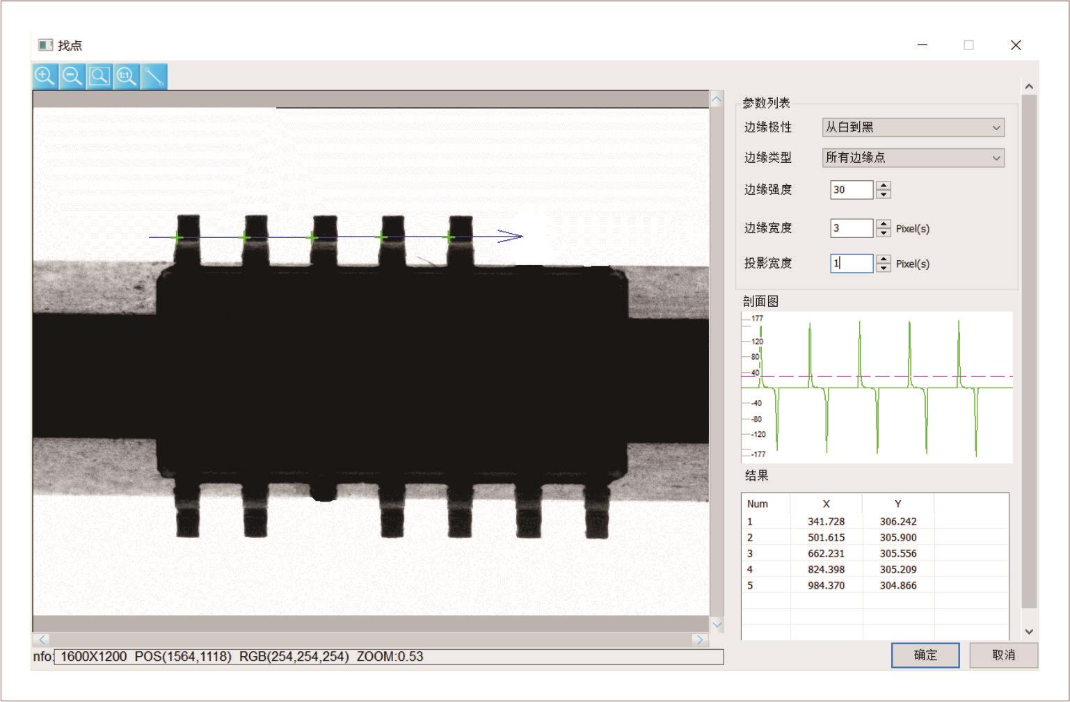 首先指定256个亮度等级的灰度图像中要处理的直线ROI区域,按直线ROI搜索方向搜索满足设定条件的边缘点。
