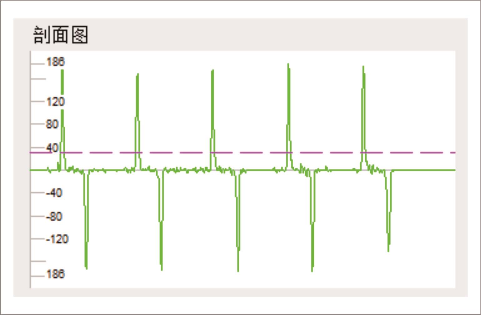 剖面图解析:显示沿直线ROI各个边缘点的强度剖面图。绿色的线代表梯度,紫色的线代表当前边缘强度值,如图3。