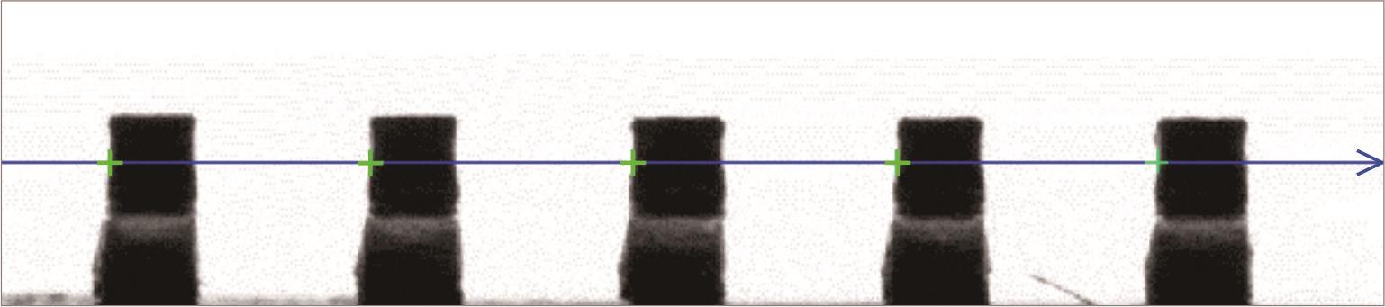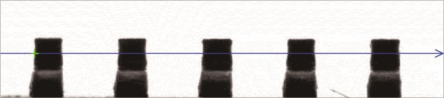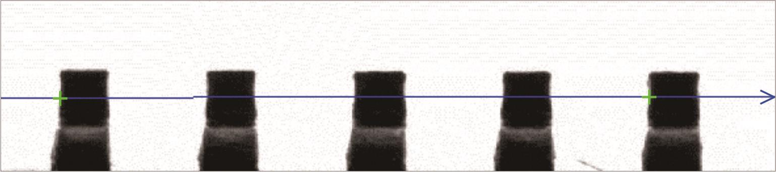 投影宽度:为降低噪声干扰,在垂直搜索线的方向上,取左右两侧相邻n个像素的均值作为该点的灰度值,其中n即为投影宽度。如图9,n=2。