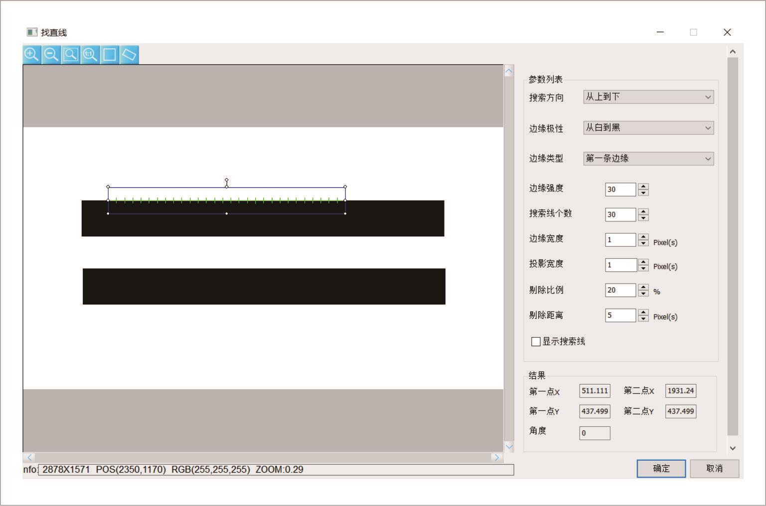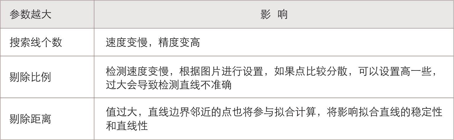 找直线工具是在256个亮度等级的灰度图像中,设定正矩形或斜矩形ROI区域,在ROI区域内,对每一条搜索线,按照设定的方向和适当的阈值搜索满足条件的边缘点。然后通过底层的拟合算法,将满足条件的边缘点按照最小二乘法、剔除比例、剔除距离拟合成直线。