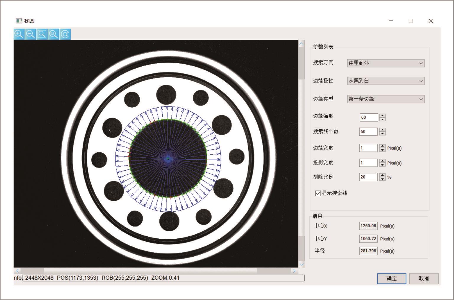 找圆算法的基本原理,在256个亮度等级的灰度图像中设定圆环形ROI区域,在ROI区域内,对每一条搜索线,按照设定的方向和适当的阈值搜索满足条件的边缘点。然后通过底层的拟合算法,将满足条件的边缘点按照最小二乘法、剔除比例拟合成圆。