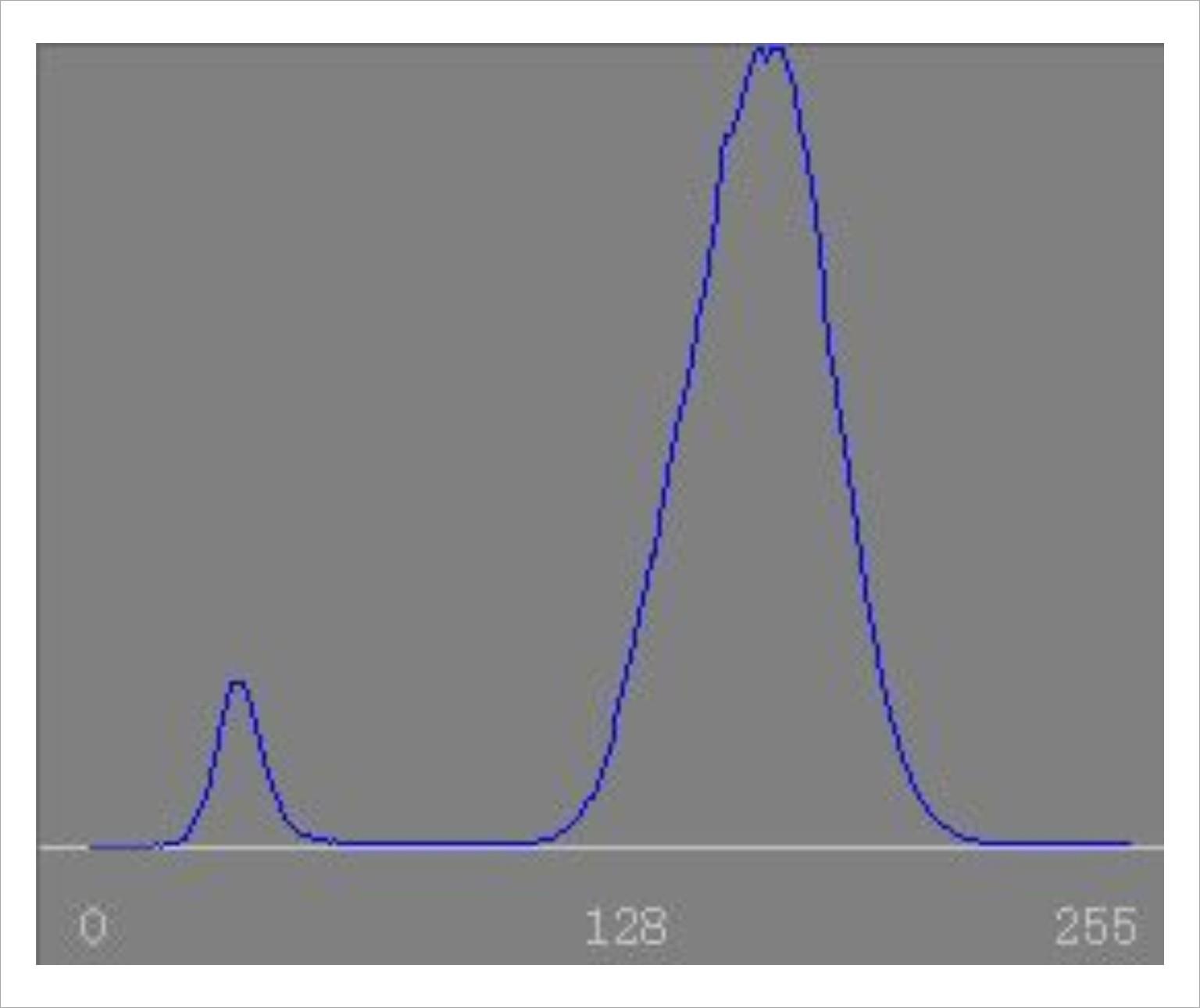 6)双峰均值二值化:具有明显双峰直方图的图像,将双峰的平均值作为阈值进行图像二值化。