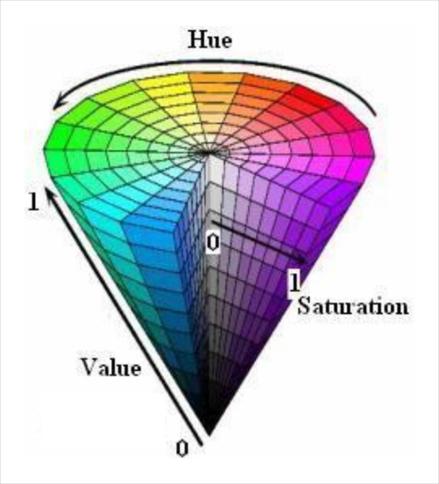 3、HSV模式:与HSL类似,该模式下亮度(L:Lightness)替换为明度(V:Value)。