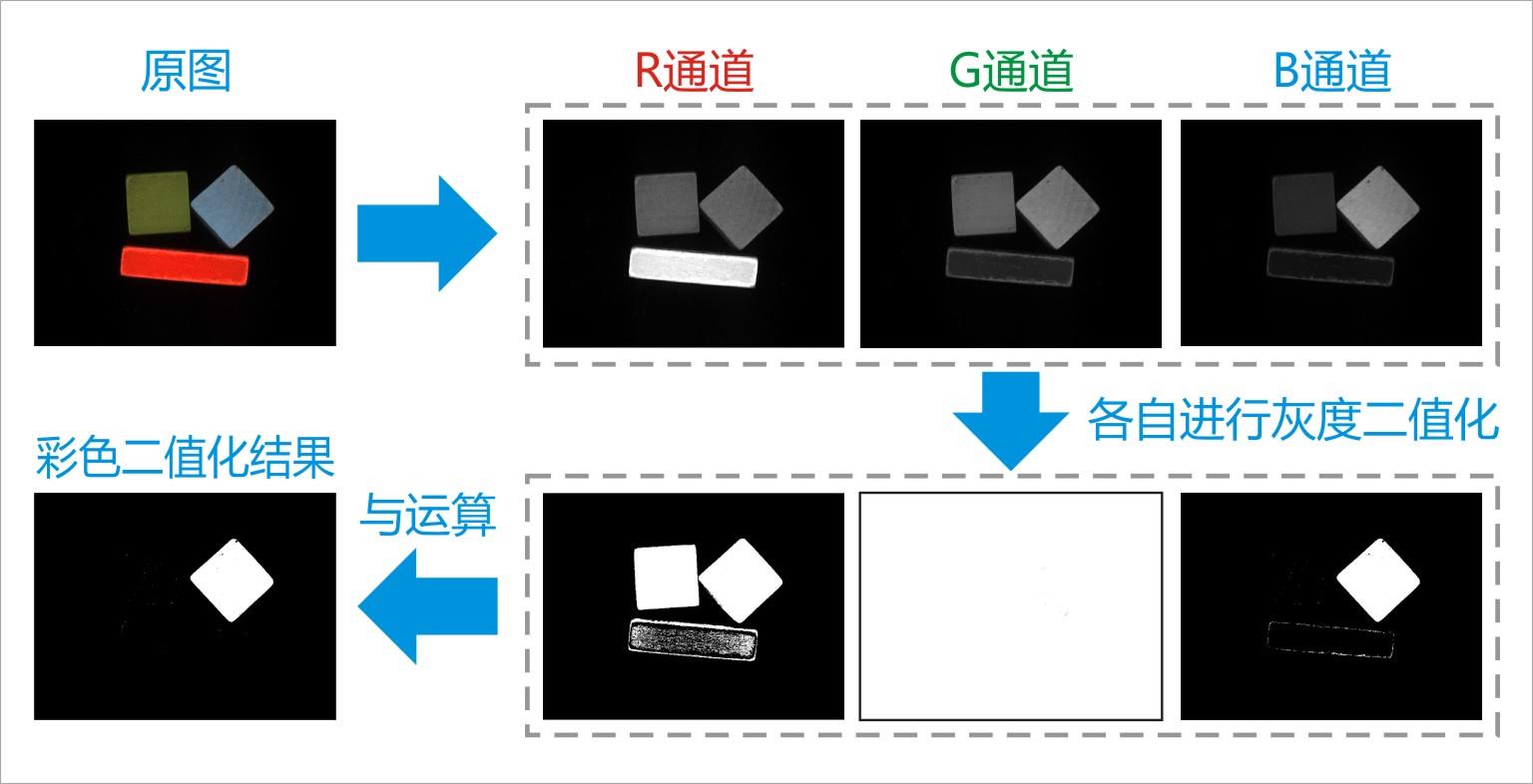 彩色二值化算法过程首先是将图像转换到指定的彩色空间模式,然后按设定的阈值对图像各个通道进行灰度二值化,最后对各个二值化结果进行与运算,得到彩色二值化结果。以图9为例,指定颜色空间模式为RGB模式,设定R通道上下限阈值为[35,227],G通道为[0,142],B通道为[59,187],其流程为: