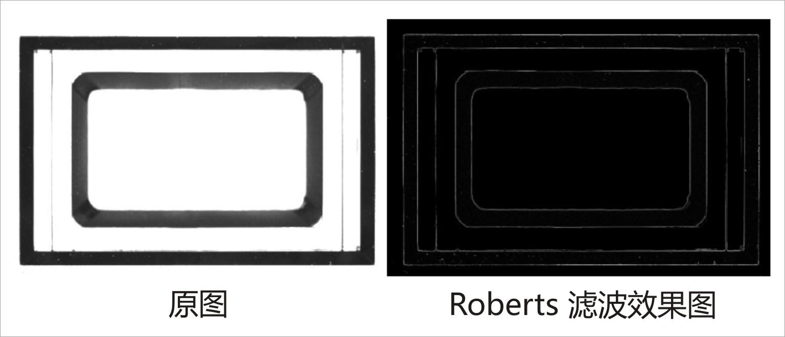 Roberts滤波定义一个2*2的模板,利用局部差分算子寻找边缘。其采用对角线方向相邻两个像素之差近似梯度幅值检测边缘。检测垂直边缘的效果好于斜向边缘,定位精度高,对噪声敏感,无法抑制噪声的影响。效果对比如图7。