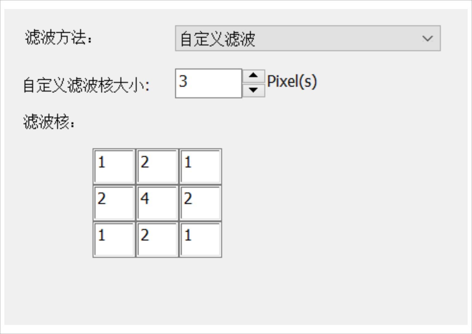 自定义滤波是将源图像与滤波核进行卷积。用户可以自己设定滤波核的大小,设定滤波核内的算法内容,实现灵活多变的滤波效果。设置界面如图9所示。