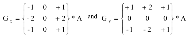 Sobel滤波包含两组3*3的矩阵,分别为横向及纵向,通过矩阵与像素灰度值进行卷积,即可分别得出横向及纵向的差分近似值,Sobel核矩阵如下:
