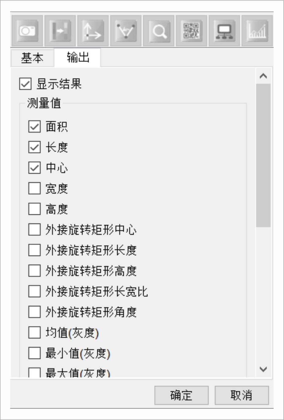 在划痕检测工具界面将参数设定好,分析到结果数据后,点击“确定”退出,切换到输出界面:勾选想要进行输出的检测值,才能在其它数据处理中对检测值进行调用。