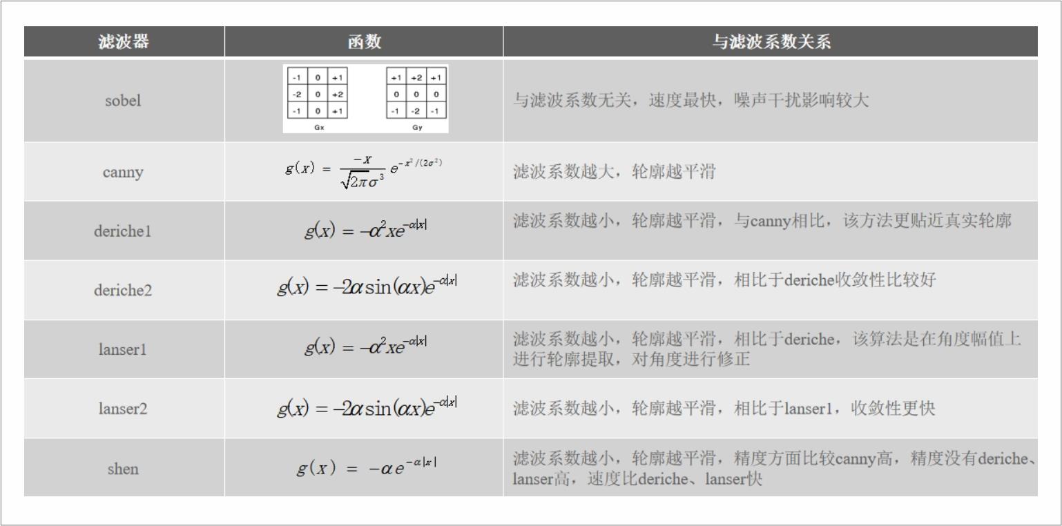 2、在边缘点集合中剔除某些边界点或填补边界间断点,并将这些边缘连接成完整的线。用于边缘检测的算子有 Sobel、Canny、Deriche1、Deriche2、Lanser1、Lanser2、Shen。
