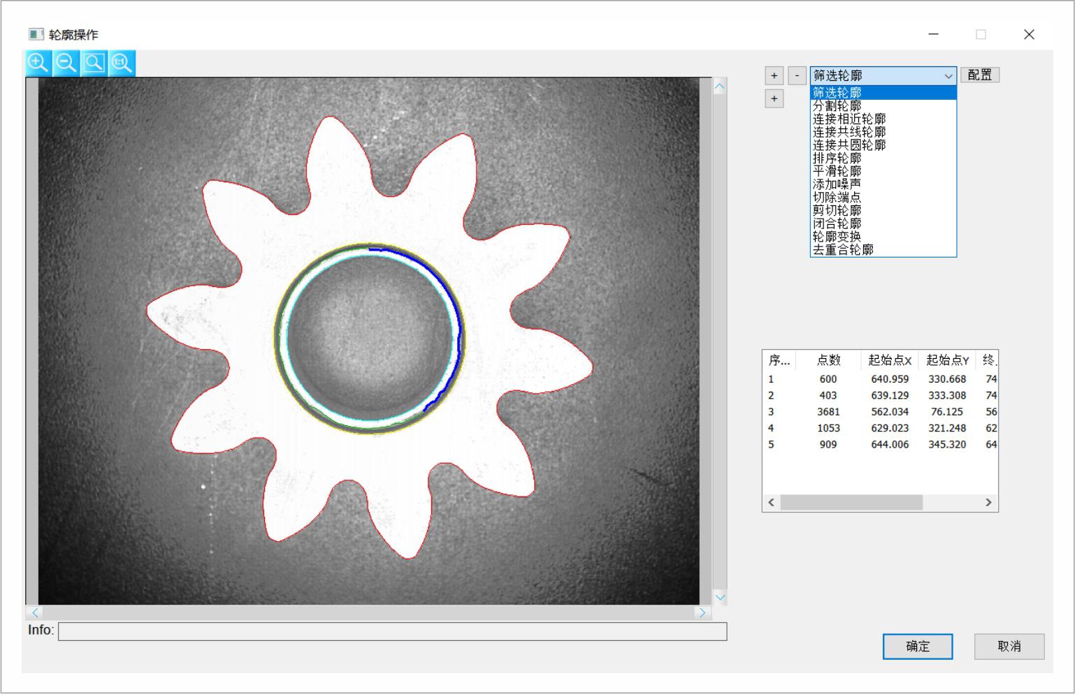轮廓操作功能是增加对轮廓的处理,可以根据长度、面积、坐标等条件对轮廓进行筛选,可以根据是否共圆、共线连接断裂轮廓,还可以去除干扰的轮廓信息等,从而获得所需要的目标轮廓。