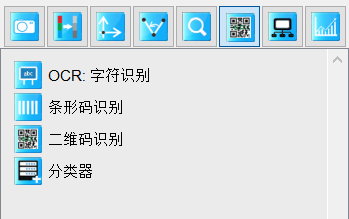 打开SciSmart智能视觉软件,在主界面右下方工具箱栏点击图像识别的图标,如图2所示,选择“条形码识别”,二维码识别同此操作: