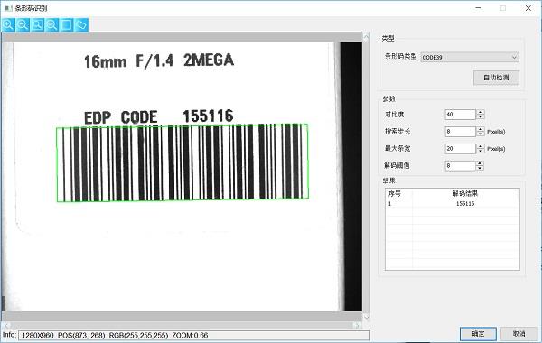 检测时通过指定待检条形码的类型(可通过“类型”栏内的自动检测按钮进行自动选定), 设定检测的参数包括:对比度、搜索步长、最大条宽,即可在指定的 ROI 区域内检测出指定类型的所有条形码,并返回定位区域和解码结果。SciSmart智能视觉软件支持同时识别多个条形码。