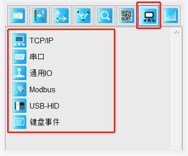 打开SciSmart智能视觉软件,在主界面右下方工具箱栏点击通讯工具的图标,如图1所示。通讯工具包含TCP/IP、串口、通用I/O、Modbus、USB-HID、键盘事件、其它等几大模块。各模块作用见表1: