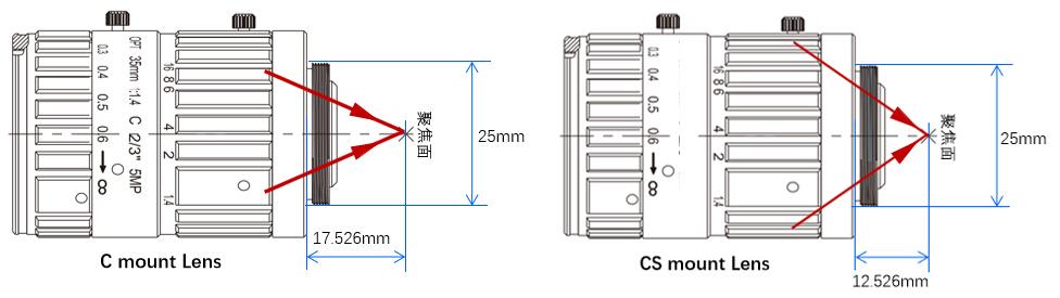 ◆C和CS接口是最常见的工业相机与镜头的国际标准接口,二者均为1英寸-32UN英制螺纹连接口,C型接口和CS 型接口的螺纹是一样的,区别在于C型接口的后截距为17.5mm,CS型接口的后截距为12.5mm。