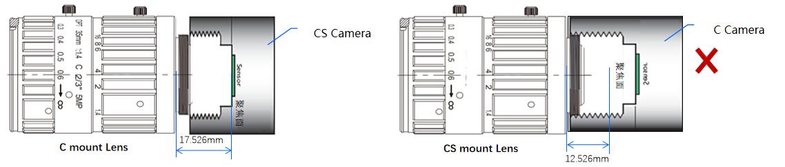 ◆C型接口的工业相机不能用CS口的镜头。(聚焦面与感光面无法重合)