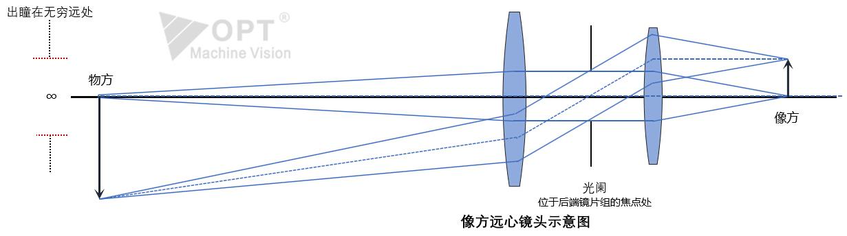 ◆像方远心镜头的入瞳位于无穷远处,即镜头到像平面的光线与主光轴平行。
