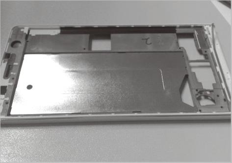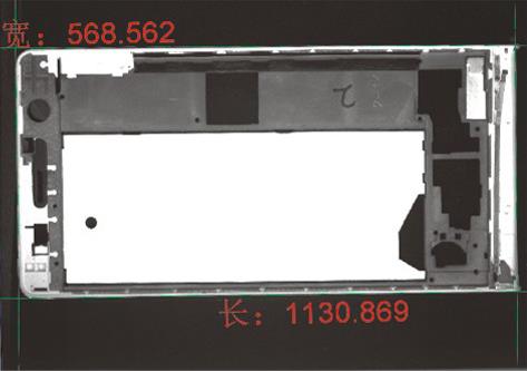 携帯電話外装ケースとLCD表示部寸法測定。対象の表面は平滑で正反射光が強いため同軸照明を選定。