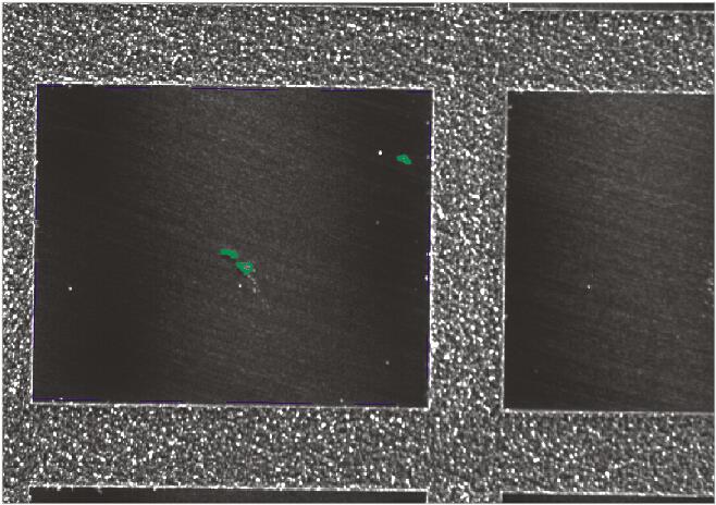 シリコンウエハ表面チッピング、かけ、亀裂など欠陥検査。バンク角60°ローアングルリング照明にて、欠陥部を強調することが出来ます。