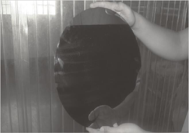 シリコンインゴッドの表面傷欠陥検査。正反射が強く、サイズも大きいため、大型の角型バー照明をローアングルに設置して傷をクリアに映します。