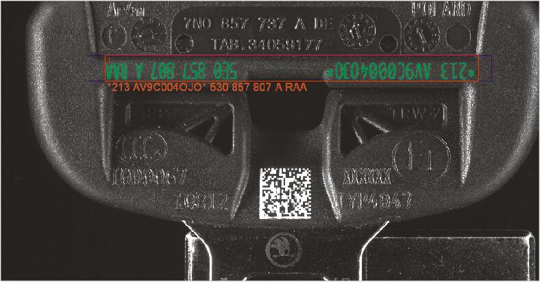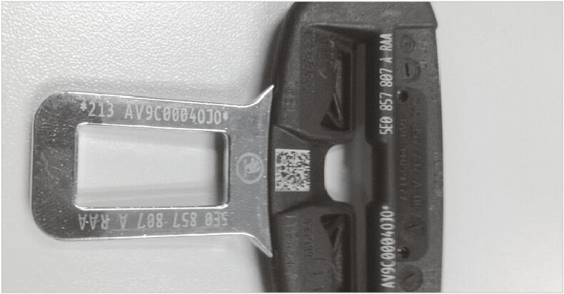 シートベルトのバックルの金属とプラスチック部分の文字認識。ハーフパイプ照明にバー照明を一定の角度で追加することで、バックルの乱反射を防ぎ表面の文字のコントラストを上げることが可能です。